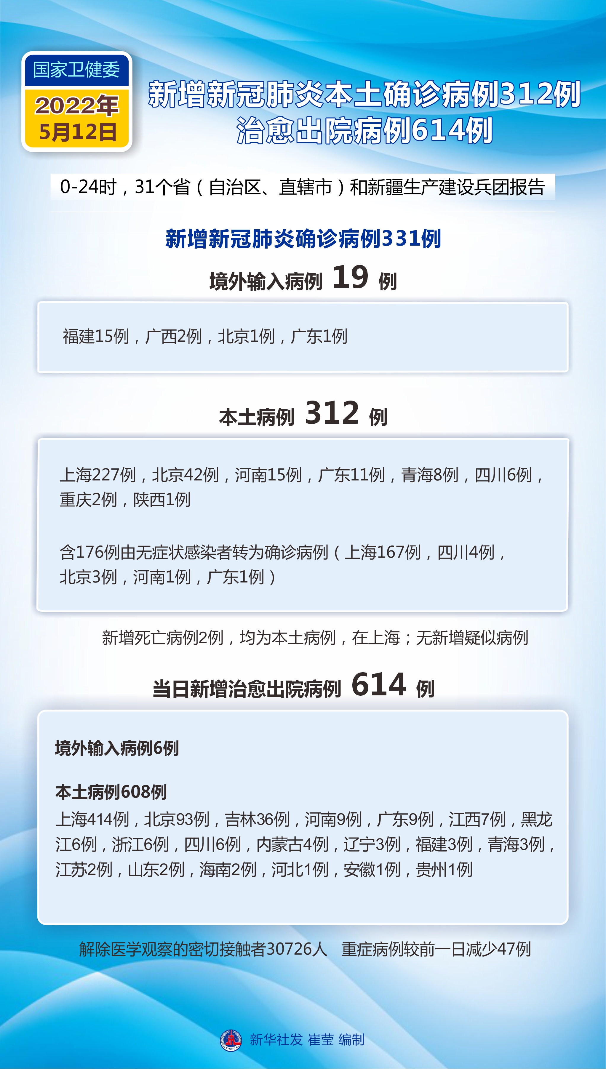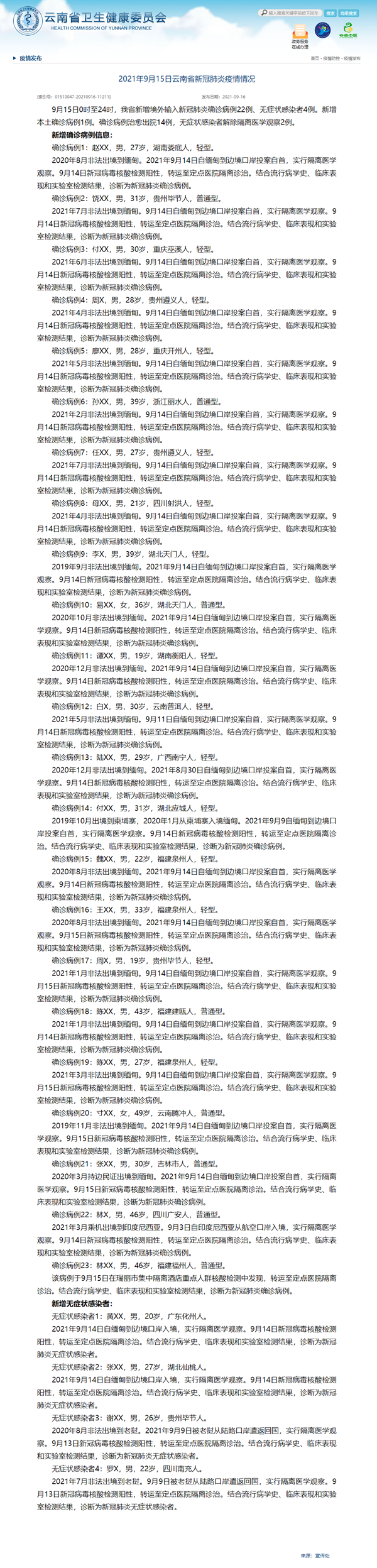 月15日0—24时,31个省(自治区、直辖市)和新疆生产建设兵团报告新增确诊病例11例,其中境外输入病例10例,本土病例1例(在云南);无新增死亡病例;无新增疑似病例。