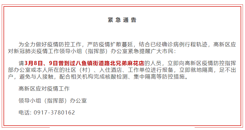 月8日8时至3月9日南京新确诊14例轨迹,汉中未报告新增本土确诊病例。3月7日8时至3月8日8时南京新确诊14例轨迹,新增本土确诊病例1例。自3月5日以来,累计报告本土确诊病例1例。病例详情 确诊病例17:男性,49岁,汉中市报告。感染关联:与外省某感染者(3月6日下午西安发布通报)于3月1日在粤珍轩(新城广场店)存在时空交集。