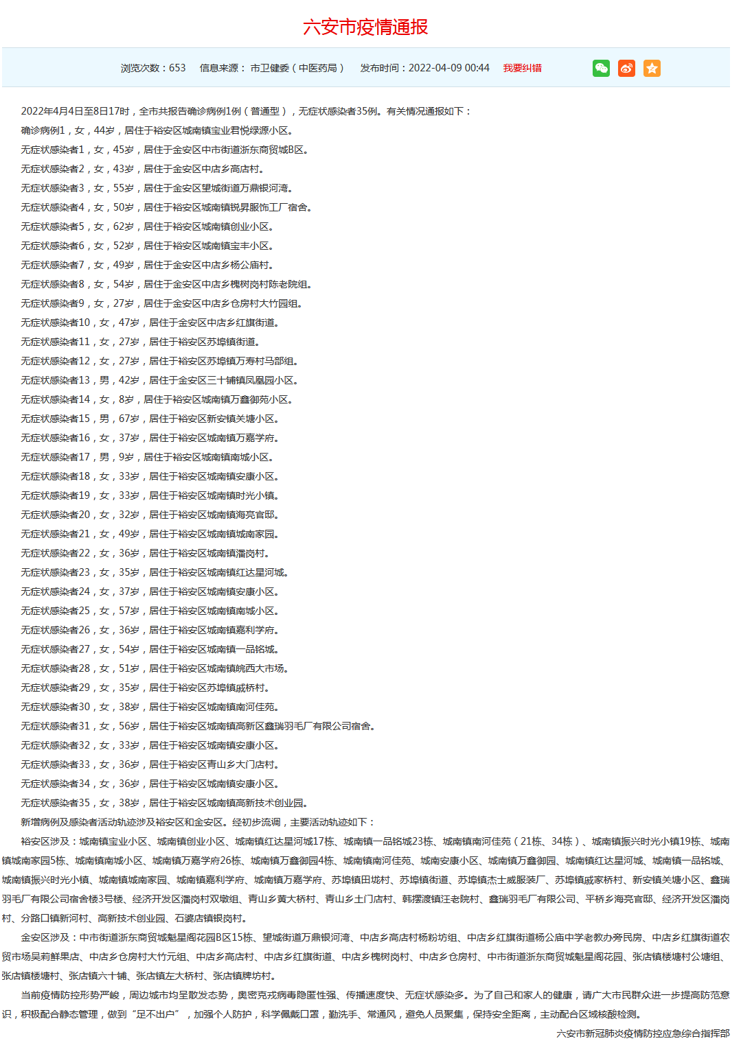 六安现在有多少例新冠病毒