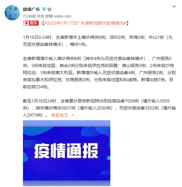 月21日16时至1月22日16时,北京市新增9例本土新冠肺炎确诊病例(轻型8例、普通型1例,含1例无症状感染者转确诊)和3例本土无症状感染者;丰台区玉泉营街道万柳园小区因近14天累计报告8例本土确诊病例,被调整为高风险地区。